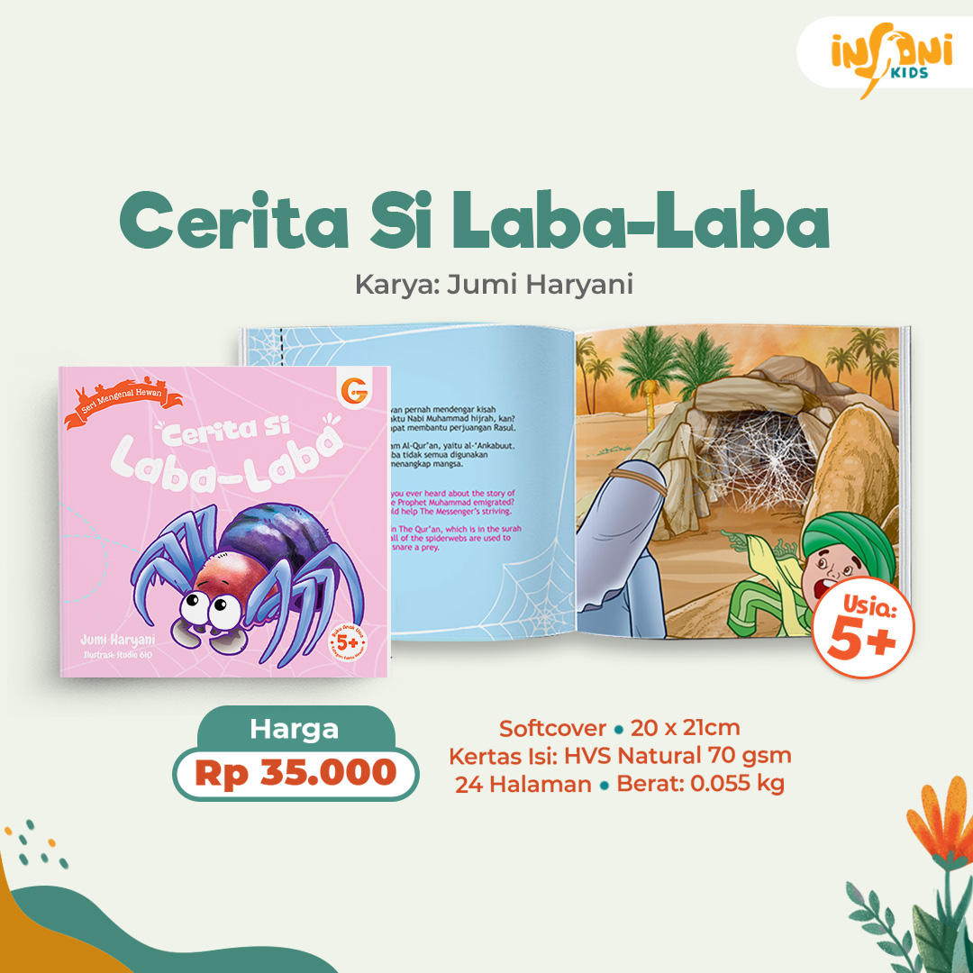 Buku cerita anak bergambar Cerita si Laba-Laba merupakan pengenalan hewan untuk balita. Buku cerita bergambar ini mengenalkan kehidupan laba-laba, bagian tubuhnya, cara berkembang biak dan cara bertahan hidup, dan habitatnya. Dilengkapi dengan fitur kamus bahasa Inggris, lembar aktivitas menebalkan huruf, melengkapi kata, dan memasangkan kata dengan gambar.